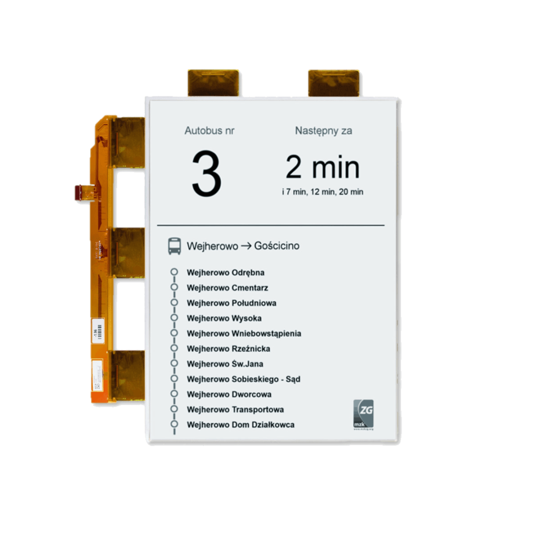 EPD (Electronic Paper Display) technology is defined as bistable. This means that each e-paper matrix cell may occur in one of two available states and no electrical energy is required to maintain displayed content, e.g. cells in black-and-white display arrange in a way to display black (state ‘0’) or white (state ‘1’) color. Energy is only needed to change the cells position, simplifying - to change the display image. Thanks to this feature, EPD technology is a perfect solution in applications where content is changed relatively rarely (e.g. e-prices, e-timetables, e-readers, smart watches and more).